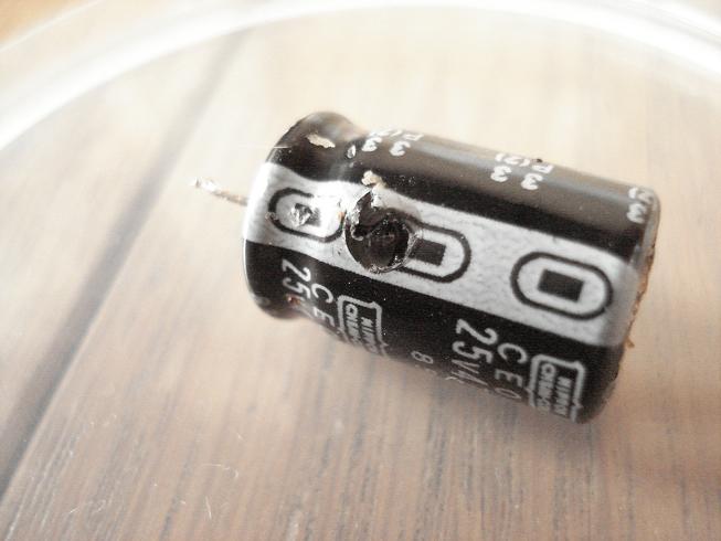 →C223の様子がおかしい。爆発(圧力解放弁の解放)はしていないようだが、電解液が上部に浸み出たような跡。外してみると、なんと側面に穴が!これまで、真空管ラジオのペーパコンが爆竹のように(笑)破裂したのを見たことがあるが、電解コンの側面破裂は初めて。一体、何が起きたのだろう?